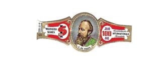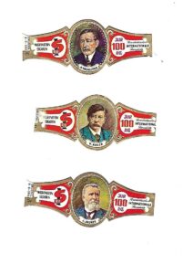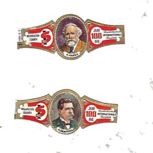 Terug naar de wel bestaande bandjes. Zij waren gewikkeld rond de sigaren van het merk Washington, die geproduceerd werden door de Baarnse – en later Hippolytushoefse – bedrijf Tingana.(naar de oprichter Piet Tinga). Tingana en de Washingtonsigaar waren beroemd vanwege de sigarenbandjes met vele series als ‘de presidenten van Amerika’, honden, Nederlandse steden en 18e eeuwse wapens. De serie van tien over De Internationale lijkt een gelegenheidsuitgave te zijn. De tekst was in het Frans en Nederlands.  Van de Belgische firma L & F. Janssens uit Maldegem is een concurrerend aanbod in de markt gezet, vijftien bandjes, maar zonder vemelding van wie de fraaie portretten waren,