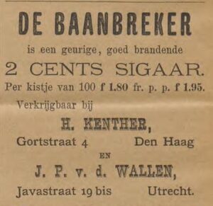 Op het einde van 1894 had de propagandist van de afdeling Den Haag, Harm Jan Kenther, zojuist in de hofstad gearriveerd, samen met de Utrechtse J. van der Wallen bedacht merchandise aan te schaffen om de afdelingen bij het publiek bekend te maken. Dat was wel nodig in het Haagse geval. De afdeling bleef lang een afdeling zonder activiteiten, pas na de komst van Franc van der Goes en het verkiezingssucces van Troelstra in 1897 werden de leden actief. Kenther en Van der Wallen verkochten sigaren met de naam van het Utrechtse partijblad De Baanbreker. Troelstra was de hoofdredacteur en voornaamste scribent. Bijgevoegde advertentie verscheen slechts een aantal keren in het weekblad op het einde van 1894. Veel sigaren zullen er niet verkocht zijn. Dat er nog een sigarenbandje opduikt met de naam De Baanbreker acht ik onwaarschijnlijk.